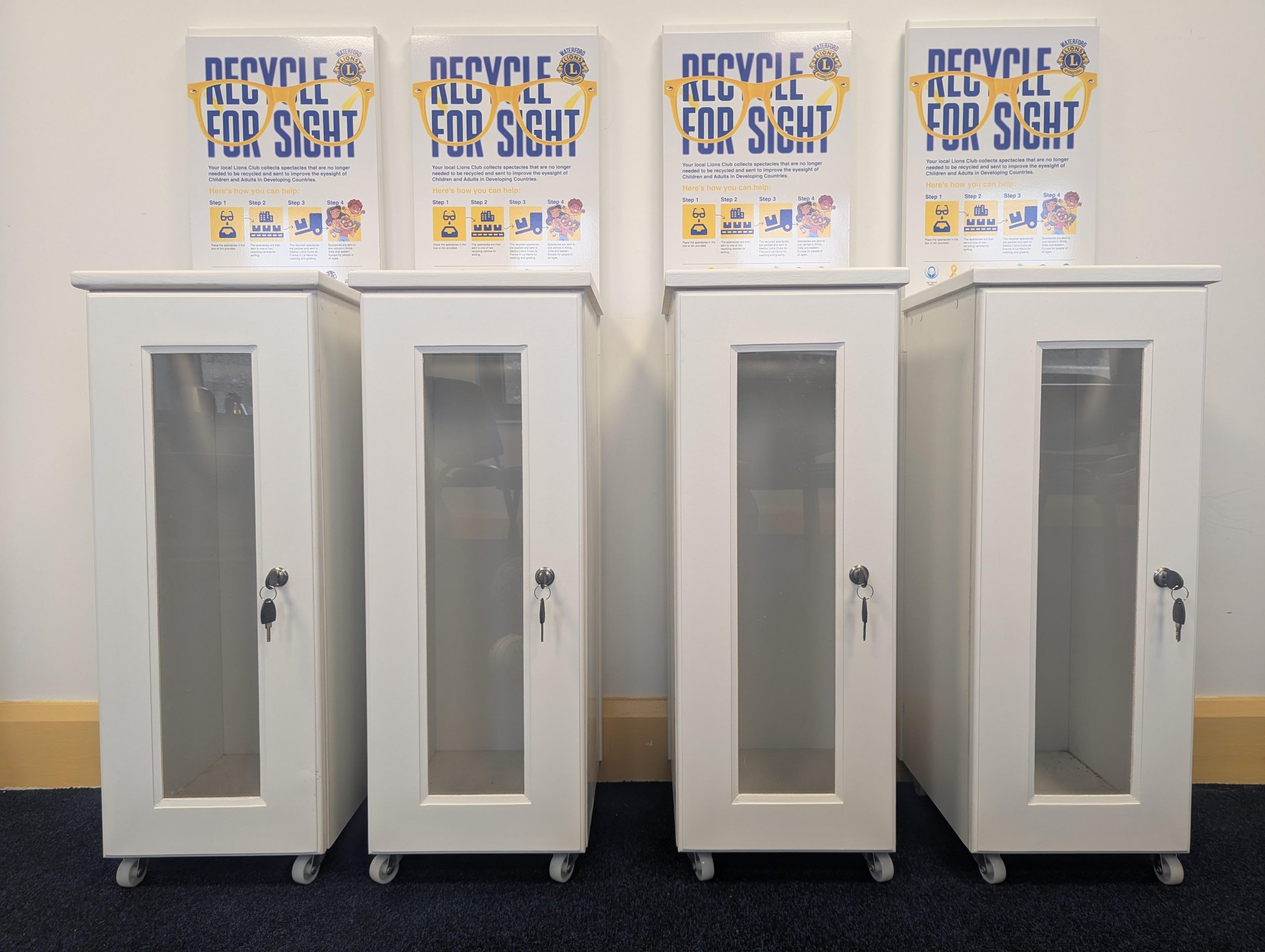 The Waterford Lions Club came to us and asked us to build them collection boxes for unused glasses. The glasses in these boxes that are donated are collected and then given to those in need.